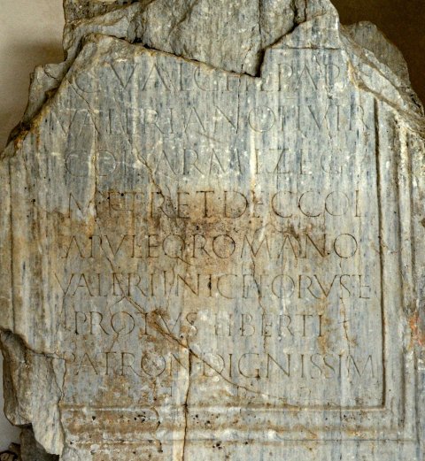 - C(aio) Val(erio) C(ai) fil(io) Pap(iria) / Valeriano IIviro / col(oniae) Sarmizeg(etusae) / metr(opolis) dec(urioni) col(oniae) / Apul(ensis) eq(uiti) Romano / Valerii Niceforus et / Protus liberti / patron(o) dignissim(o) / l(ocus) d(atus) d(ecreto) d(ecurionum)