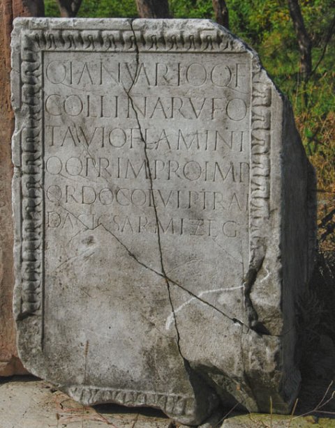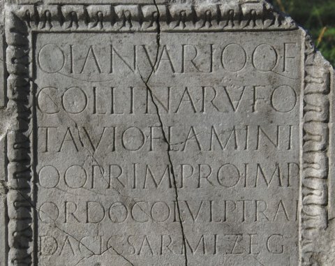 - Q(uinto) Ianuario Q(uinti) f(ilio) / Collina Rufo / Tavio flamini / q(uin)q(uennali) prim(o) pro Imp(eratore) / ordo col(oniae) Ulp(iae) Trai(anae) / Dacic(ae) Sarmizeg(etusae)
