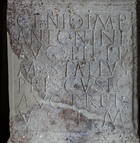 - Genio Imp(eratoris) / Antonini / Aug(usti) Pii p(atris) p(atriae) / M(arcus) Statius / [P]riscus leg(atus) / [A]ug(usti) pr(o) pr(aetore) / v(otum) s(olvit) l(ibens) m(erito)