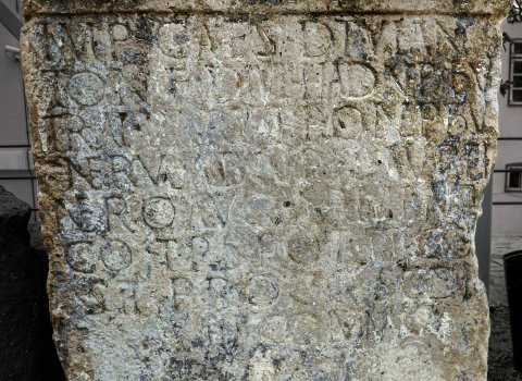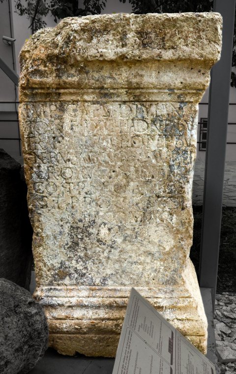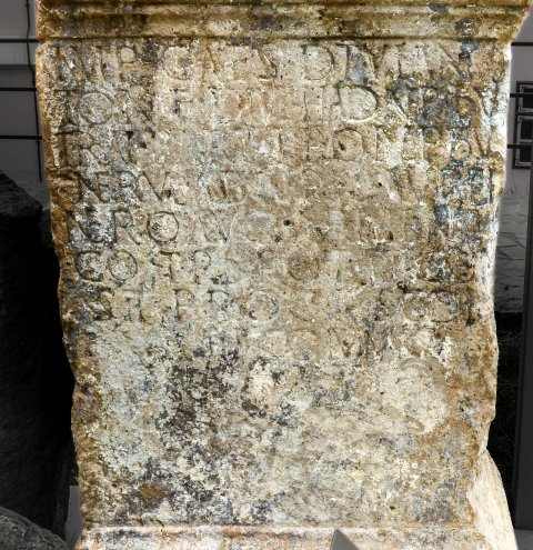 - Imp(eratori) Caes(ari) divi An/toni(ni) f(ilio) divi Had(riani) nep(oti) divi / Trai(ani) Parth(ici) pronep(oti) divi / Nervae abnep(oti) L(ucio) Aurel(io) / Vero Aug(usto) Armenia/co trib(unicia) pot(estate) IIII co(n)/s(uli) II proco(n)s(uli) coh(ors) / II Fl(avia) Com(magenorum)