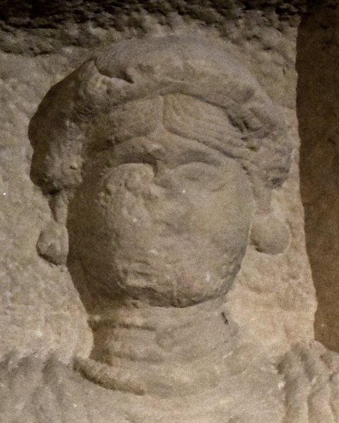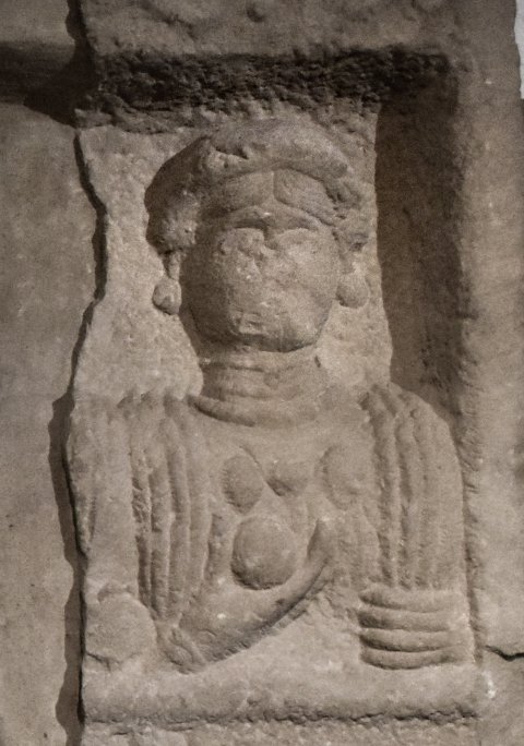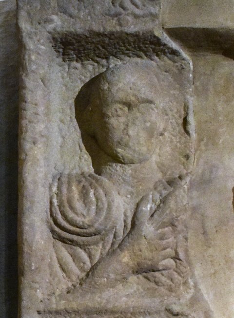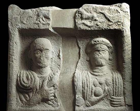 Im Hauptbild Familie: zwischen Säulen mit Spiralkanneluren Brustbilder von drei Personen. Links Mann: kahlköpfig, Toga. Rechts einheimische Frau: Haube, Umhang, Ohrgehänge, drei Halsreifen (Lunula-Anhänger), Brustschmuck, Armreif, Fingerring, in der Rechten Apfel. Von der Figur in der Mitte nur Umrisse erhalten. - Inschrift