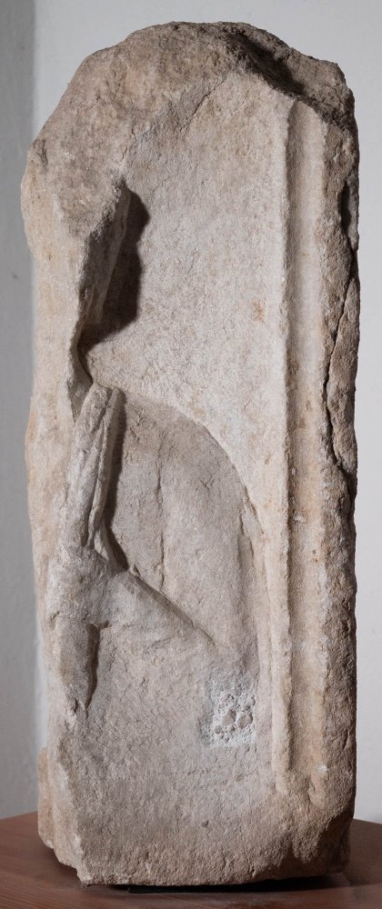 - Brustbild einer Frau mit Umhang, rechts Rest des Rahmens erhalten.