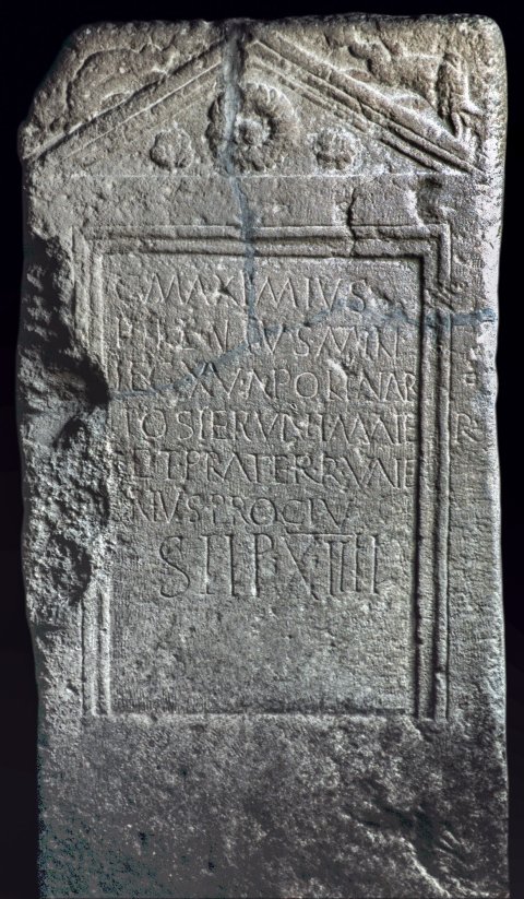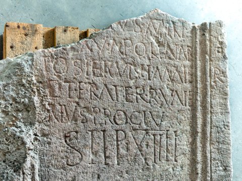 - C(aius) Maximius / Bilenius mil<e=I>(s) / leg(ionis) XV Apol(l)ina(ris) / pos<u=I>erunt mater / et <f=P>rater <P=R>(ublius) Vale/rius Proc(u)lus / stip(endiorum) XIIII