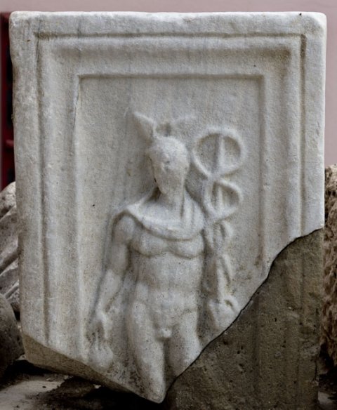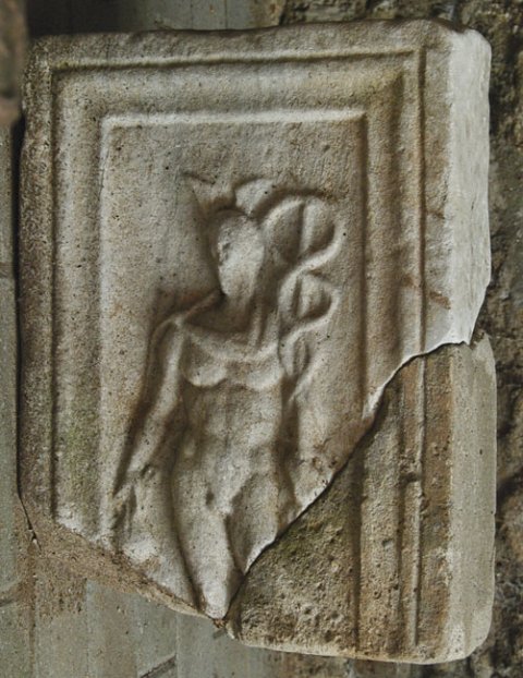 - Mythische Figur: Mercur mit Flügelkappe, Geldbeutel und Caduceus.
