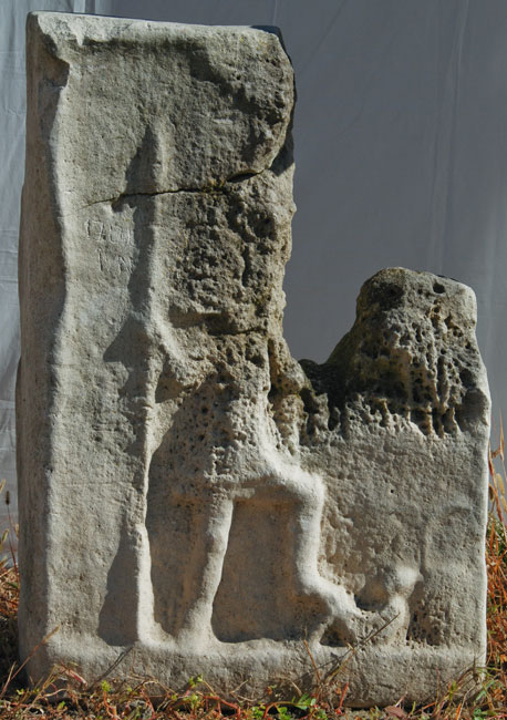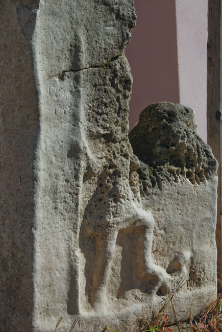 - rechts u. hinten abgebr., stark verwaschen, durch den Block vertikale Bohrung