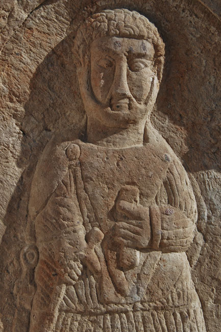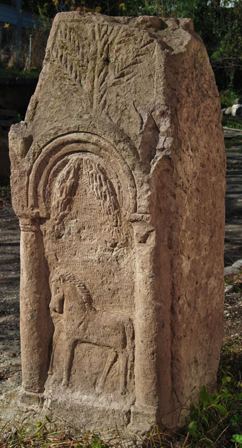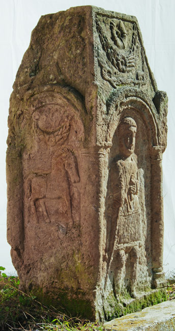 - Pfeiler mit Dach in Form eines Pyramidenstumpfes. An den vier Ecken Säulen, die profilierte Bögen tragen. Auf der Vorderseite stehende Ganzfigur eines bärtigen Soldaten (Offizier) im Sagum, mit Stab (vitis) und Rolle (volumen). Waffen: Schwert. Auf den Nebenseiten Pferd unter Zweigen und Girlande. Auf dem Dach vorn zwei Delphine, Girlande, Rosette, auf den Nebenseiten Zweige und Weinranke.