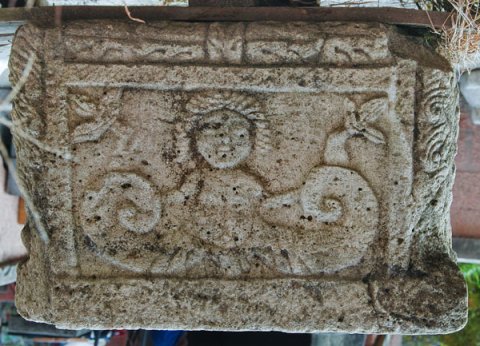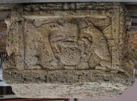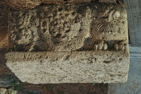 - Auf vier Seiten reliefierter Block. Auf Vorder- und Rückseite Kopf (Gorgoneion) zwischen liegenden Löwen, auf den Nebenseiten Krater zwischen Greifen und Meerwesen (Triton ? Skylla ?). Über den Nebenseiten pulvini mit Blattdekor.