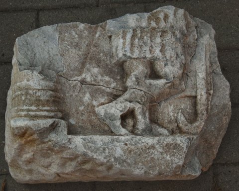 - Mythische Figur: Unterteil eines stehenden Attis mit Pedum, an der linken Seite Säule.