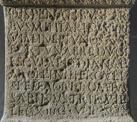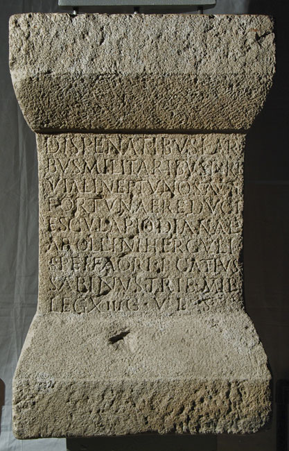 - Dis Penatibus Lari/bus Miltaribus Lari / Viali Neptuno Saluti / Fortunae Reduci / (A)esculapio Dianae / Apollini Herculi / Spei Fa(v)ori P(ublius) Catius / Sabinus trib(unus) mil(itum) / leg(ionis) XIII G(eminae) v(otum) l(ibens) s(olvit)