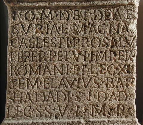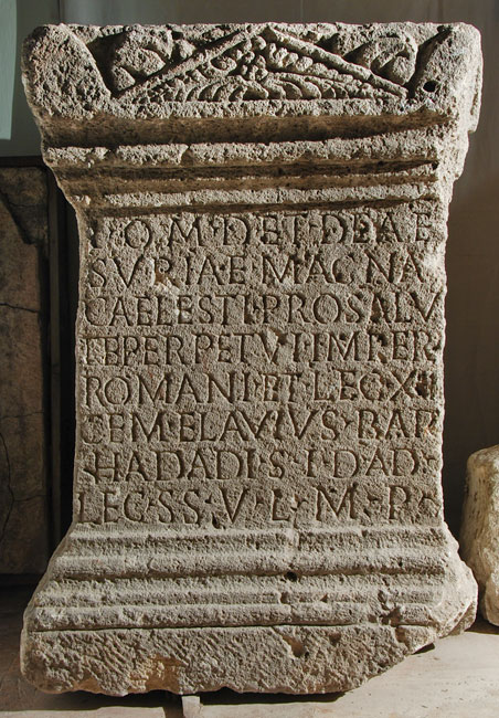 - I(ovi) O(ptimo) M(aximo) D(olicheno) et deae / Suriae (!) Magnae / Caelesti pro salu/te perpetui imperi(i) / Romani et leg(ionis) XIII / Gem(inae) Flavius Bar/hadadi s(acerdos) I(ovis) D(olicheni) ad / leg(ionem) s(upra) s(criptam) v(oto) l(ibens) m(erito) p(osuit)