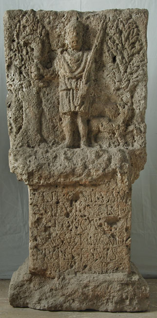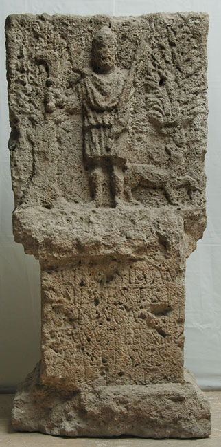 - Altarförmiger Sockel mit Inschrift, darauf Reliefblock mit zwischen zwei Bäumen stehendem Silvanus in kurzer Tunica, Mantel, Mütze, im linken Arm Stab, in der Rechten gebogenes Messer, neben dem linken Bein Hund.