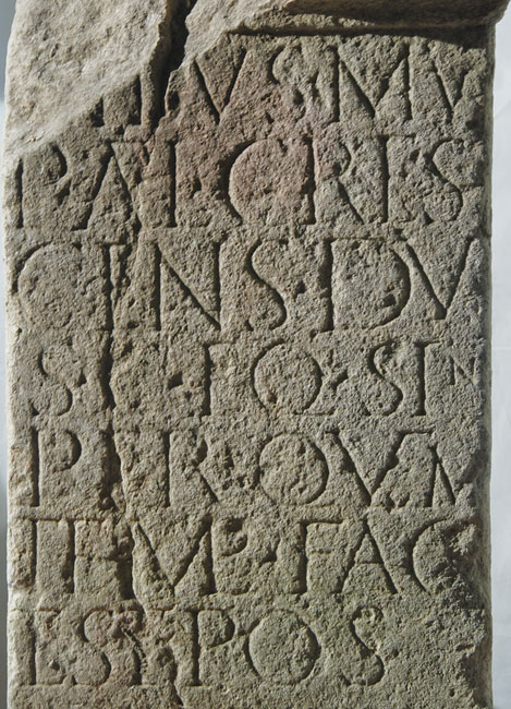 - [---]ibus MV / P(ublius) Ael(ius) Cres/cens du(plicarius) / s(ingularis) c(onsularis) eq(uitum) sin(gularium) / per quem / templ(um) fac(tum) / est pos(uit)