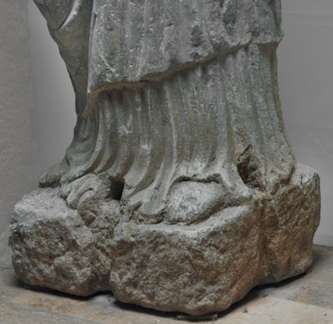 - Porträtstatue einer stehenden Frau mit über den Kopf gezogenem Mantel, in der rechten Hand Kästchen (?).
