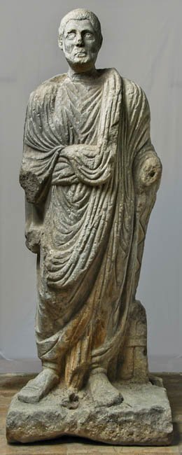 - Stehender bärtiger Togatus, neben dem linken Fuß Rollenbündel.