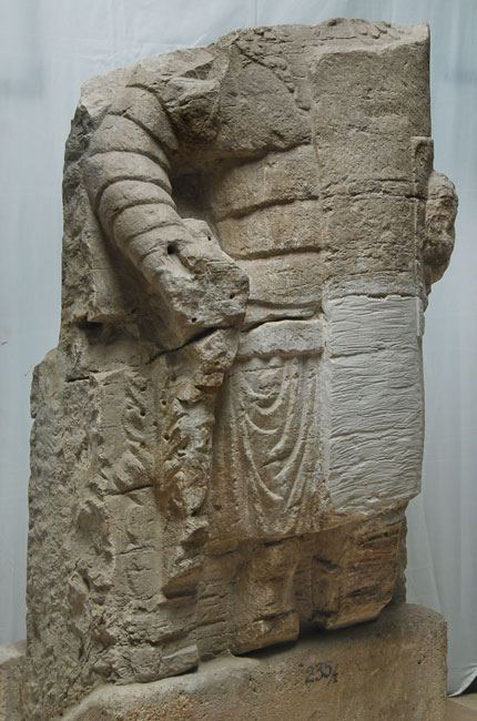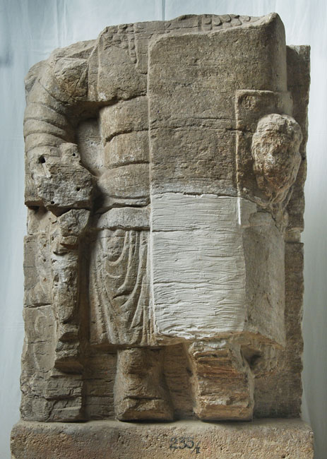 - Stehender Soldat (centurio) in kurzer Tunica. Waffen: Panzer (Lorica), an der linken Seite eckiger Schild mit Gorgoneion als Schildzeichen, in der rechten Hand Stock (vitis).