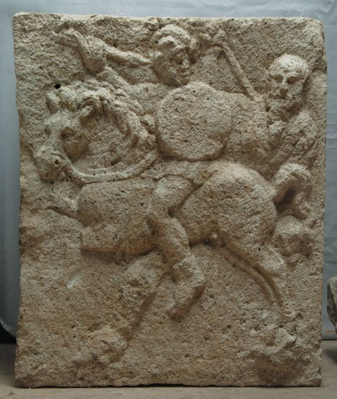 - Reiter (Soldat). Waffen: Helm, Rundschild, Lanze. Rechts hinter dem Pferd bärtiger Barbar.