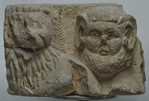 - Mythische Figur: Kopf des Jupiter Ammon zwischen liegenden Löwen. Teil der Bekrönung eines Pfeilergrabmals?