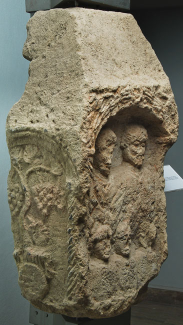 - Pfeiler mit glattem Pyramidenstumpfdach. Auf drei Seiten Bogennische zwischen Säulen mit Spiralkanneluren. Vorn Brustbilder einer Familie: Frau, bärtiger Mann , vorn drei Kinder. Auf der linken Nebenseite Krater mit Weinrebe, auf der rechten Pfau (?).