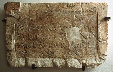 - D(is) M(anibus) / Aur(elia) Sura v(iva) f(ecit) s(ibi) et / Aur(elio) Tricconi con(iugi) / kar(issimo) et Aur(elio) Urso fil(io) / ob(ito) ann(orum) XXXII