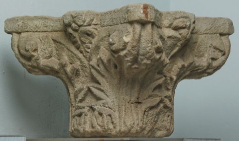 - Korinthisches Kapitell mit einfachem Akanthusblattkranz, am Abacusrand Blattrosetten.
