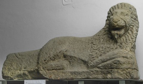 - Auf dem halbrunden Abschlussbalken (Lorica) einer Mauer liegender Löwe, unter der Vorderpranke Tierkopf.