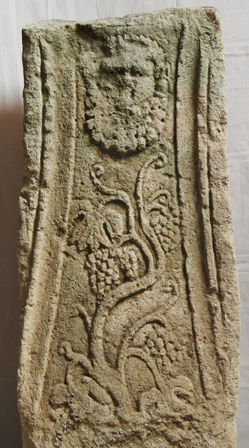 - Auf der Vorderseite Weinrebe, darüber bärtige Maske (Silen ?). Auf der linken Seite Delphin und Dreizack.