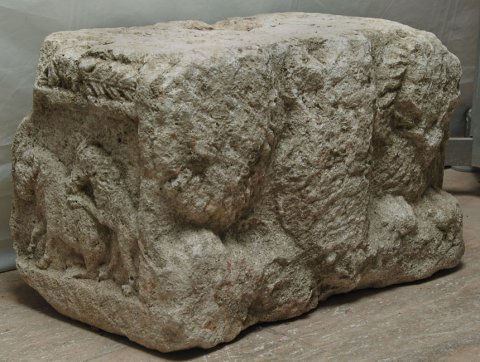 - Auf der erhaltenen Längsseite bärtiger Kopf zwischen Löwenprotomen, auf der linken Seite Tiere (Löwe und Stier), auf der rechten Meerwesen (Hippokamp).