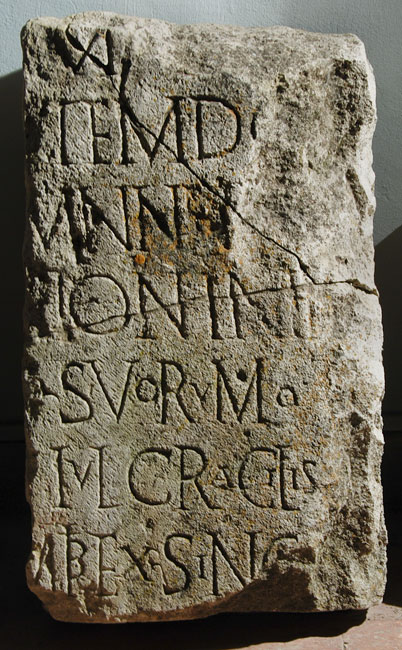 - [I(ovi) O(ptimo)] M(aximo) D(olicheno) / [pro salu]tem(!) do/[minoru]m nnn(ostrorum) [Se]/[veri et A]ntonini e[t] / [Getae sua] suorumq(ue) / [omnium] Iul(ius) Gracilis / [eques n(umeri)] M(aurorum) Tib(iscensium) ex sing(ulari) / [co(n)s(ularis) ---