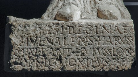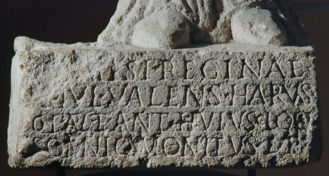 - [N]emesi Reginae / C(aius) Iul(ius) Valens harus(pex) / col(oniae) Apul(ensis) et ant(istes) huiusc(e) loci / somnio monitus l(ibens) p(osuit)