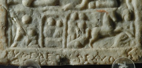- Mythos (Mithras): Stiertötung (Tauroktonie) mit Cautes und Cautopates, darüber und darunter weitere Szenen. Inschrift auf der oberen und unteren Rahmenleiste.