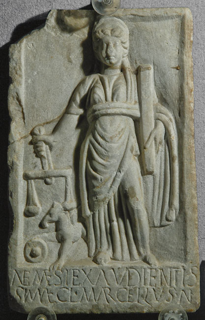 - Mythische Figur: stehende Nemesis in Chiton und Mantel, Diadem, im linken Arm Maßstab, in der Rechten Waage. Unter dieser Greif mit Schale. Inschrift auf dem Sockel.