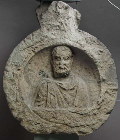 - Medaillon mit Kranzrahmen und Aufsatz. Brustbild eines bärtigen Mannes im Sagum mit Scheibenfibel.