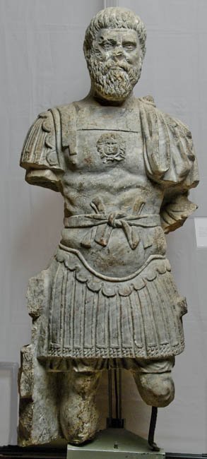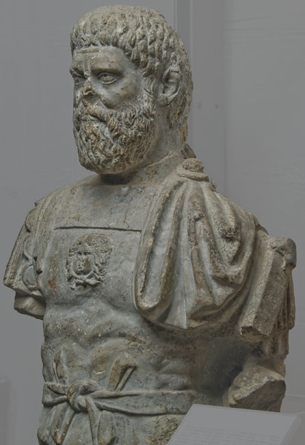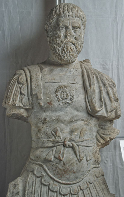 - Stehender bärtiger Mann im Panzer mit Gorgoneion und Offiziersbinde. Historische Person ? (Publius Helvius Pertinax ?).