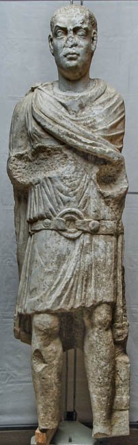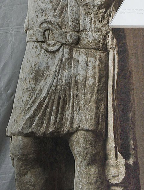 - Stehender Mann in kurzer Tunica, Gürtel mit Ringschnalle, Mantel mit Scheibenfibel auf der rechten Schulter. Waffen: an der linken Hüfte Schwert in Scheide mit Dosenortband. Hinter dem linken Bein Rollenbehälter (?).