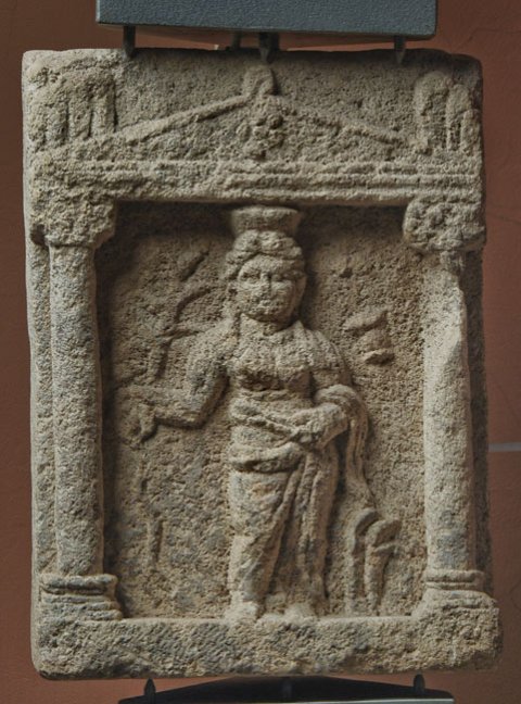 - Mythische Figur: unter einem auf Säulen ruhenden Giebel mit Rosette und Akroteren stehende Göttin (Ceres ?) mit Kalathos, Chiton und Mantel, in der Rechten Zweig, in der Linken ?. Neben der linken Schulter Korb (?), neben dem linken Bein ?.