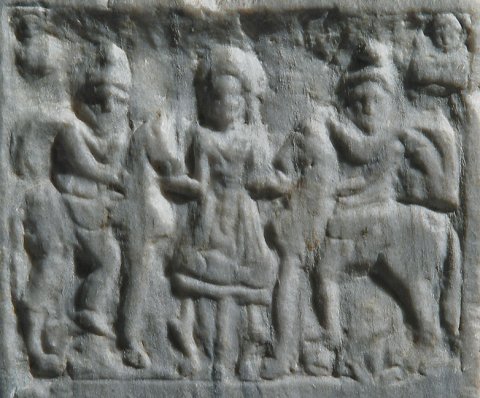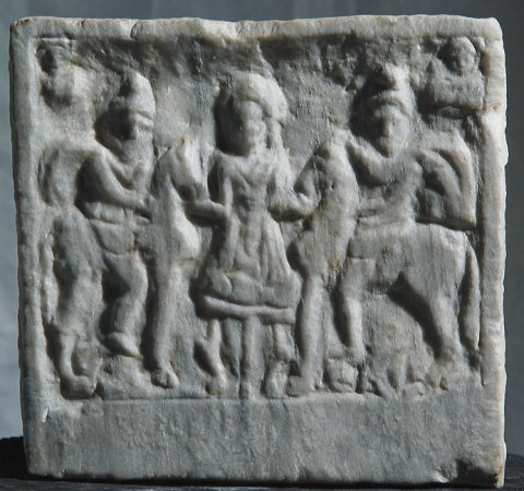 - Mythische Figuren (sogen. Donaureiter): stehende Göttin zwischen zwei Reitern in orientalischer Hosentracht und phrygischen Mützen. Vor der Göttin dreibeiniger Tisch mit Speisen. In den oberen Ecken Büsten (So, Luna).