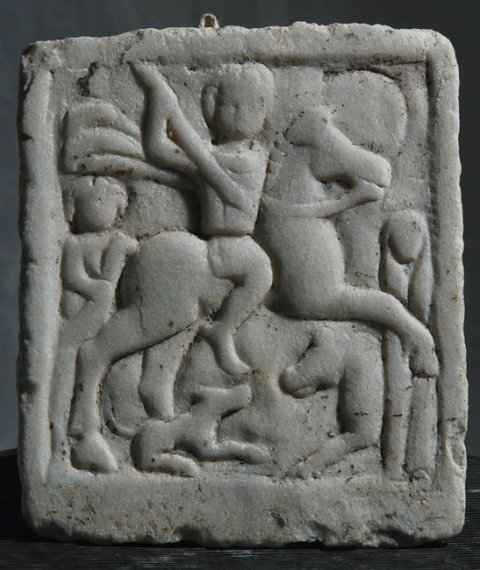 - Mythische Figur: Thrakischer Reiter mit erhobener Lanze, unter dem Pferd Hund und Bär, rechts stehende Frau, links männliche Figur (?).