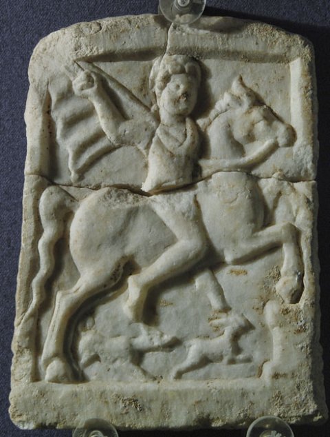 - Mythische Figur : Thrakischer Reiter mit erhobener Lanze, unter dem Pferd Hund und Hase, rechts Altar.