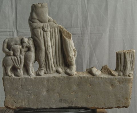 - Mythische Figuren: links auf Panther reitender Silen mit Kantharos, in der Mitte nebeneinander stehendes Paar Liber Pater (Dionysos) mit Mantel um die Hüften und Libera (Ariadne), rechts Unterteil einer stehenden bekleideten Frau und Fuß einer weiteren Figur. Durchbrochenes Relief, Figuren oben rundplastisch.