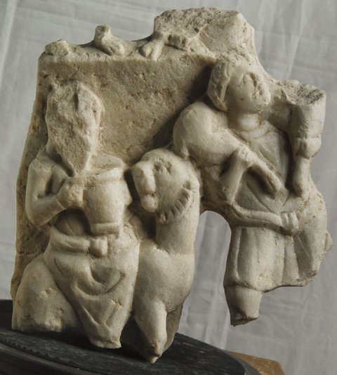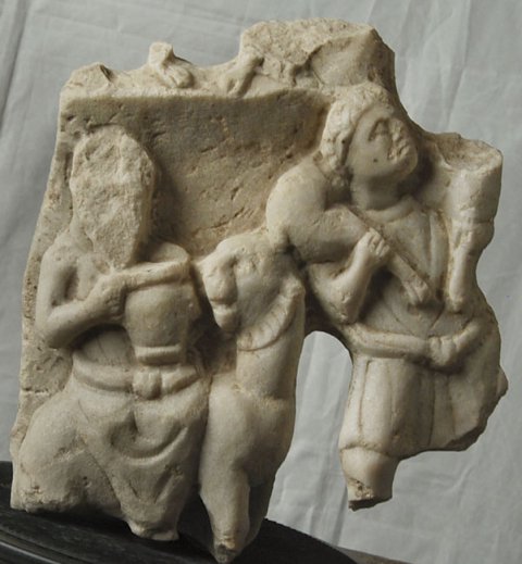 - Mythische Figuren: links auf Panther reitender Silen mit Kantharos, daneben Mann (Diener) in kurzer Tunica mit Tier (Reh ?) auf den Schultern. Darüber Reste eines Relieffeldes mit kleineren Figuren (nur Füße erhalten).