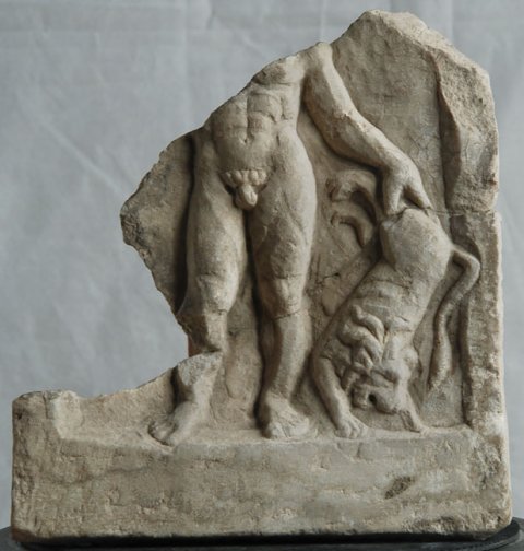 - Mythische Figur: nackter stehender Hercules, packt mit der Linken den Löwen am Hinterbein.