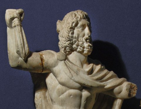 - Mythische Figur: Jupiter in Schrittstellung, nackt bis auf Mantel mit Scheibenfibel, in der erhobenen Rechten Blitzbündel, vor ihm Baumstamm mit großer Schlange.