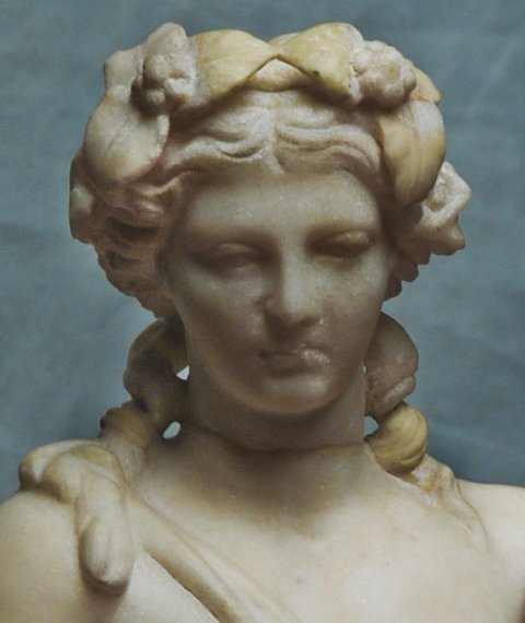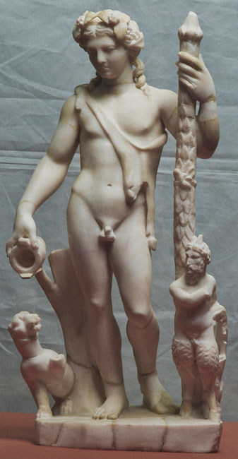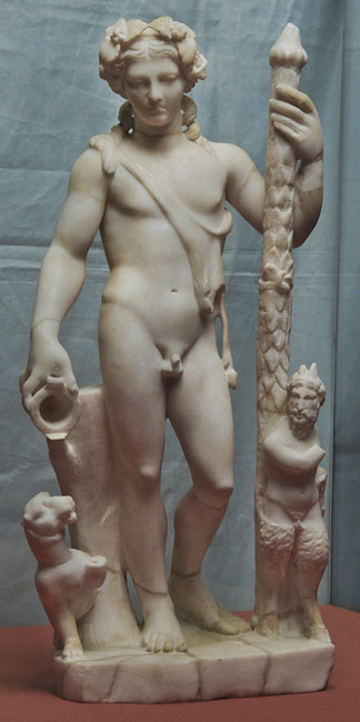 - Mythische Figur: jugendlicher Liber Pater (Dionysos) mit Nebris und Efeukranz, in der Linken Thyrsosszepter, in der Rechten Kantharos. Am rechten Bein Baumstammstütze und hockender Panther, vor dem Thyrsosstab kleiner Pan.