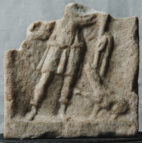 - Mythische Figur: Gottheit (Diana ? Dionysos ? Nemesis ?) in kurzem Chiton und Stiefeln, im linken Arm Stab (Fackel ?), rechts sitzendes Tier.