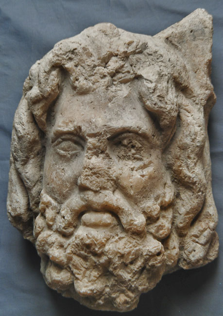 - Mythische Figur: bärtiger Jupiterkopf mit langen Locken.