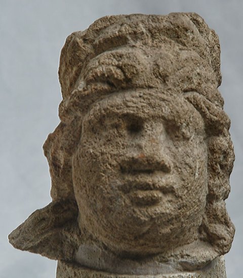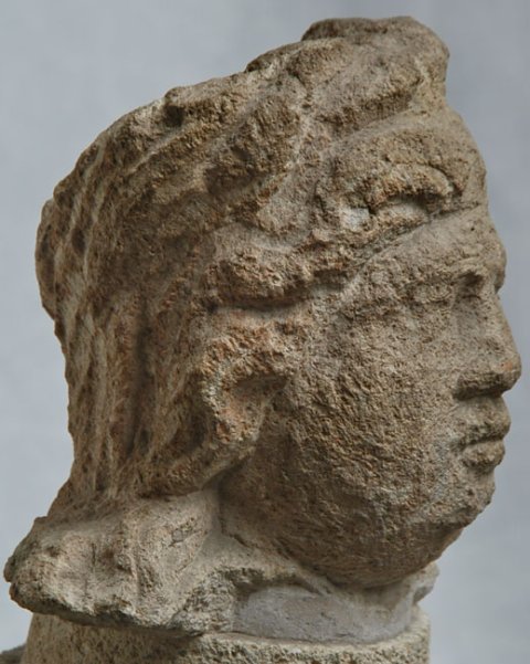 - Mythische Figur ? Kopf mit offenem Haar und Kranz. Mänade ? Satyr ?