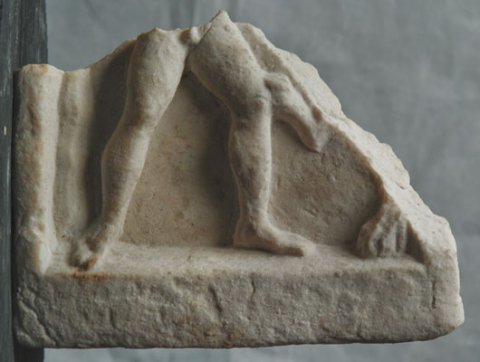 - Mythische Figur : Beine eines nackten ausschreitenden Mannes, vor ihm Reste eines hockenden Raubtiers mit erhobener Pranke (Apollo mit Greif ? Hercules ?).