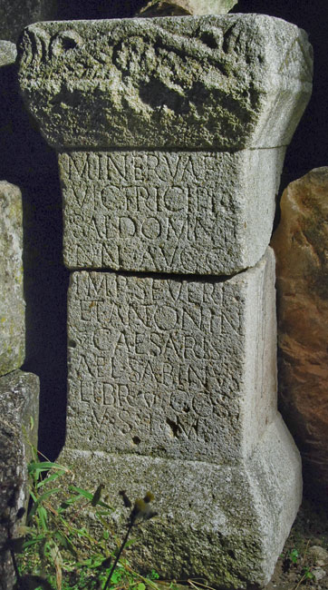 - Minervae / victrici pro / sal(ute) dominn(orum) / nn(ostrorum) Augg(ustorum) / imp(eratoris) Severi / et Antonini / Caesaris / Ael(ius) Sabinus / libr(arius) co(n)s(ularis) / v(otum) s(olvit) l(ibens) m(erito)