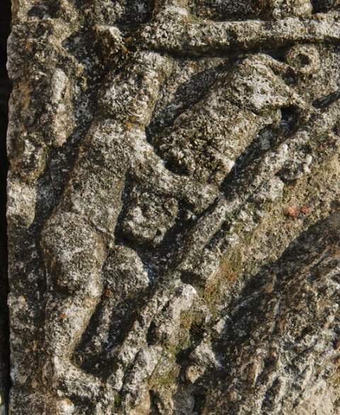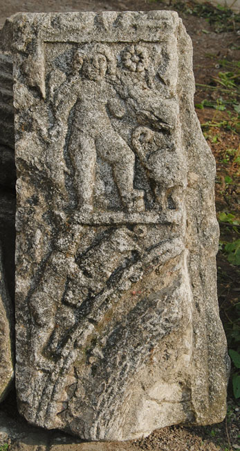 - Oben Genius (Erot) mit Girlande und Rosette. Unter der Girlande Tier. Darunter Rest eines Bogens mit Medaillon im Kranzrahmen. Im Zwickel daneben Hercules und Löwe ?