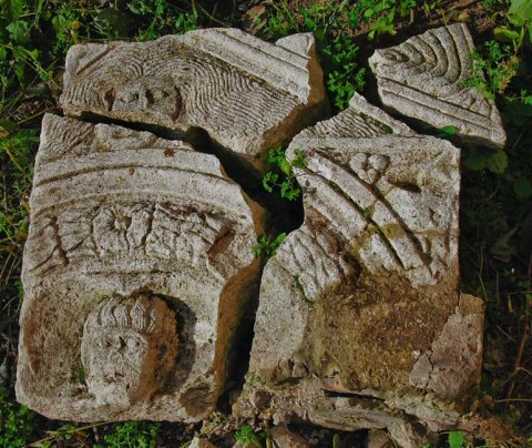 - Giebel mit Gorgoneion, Seitenakrotere. Bildfeld mit Bogen, darin Medaillon mit Kranzrahmen und Muschelnische, darin Kopf eines Jünglings. Im Zwickel über dem Bogen Delphin und Rosette.